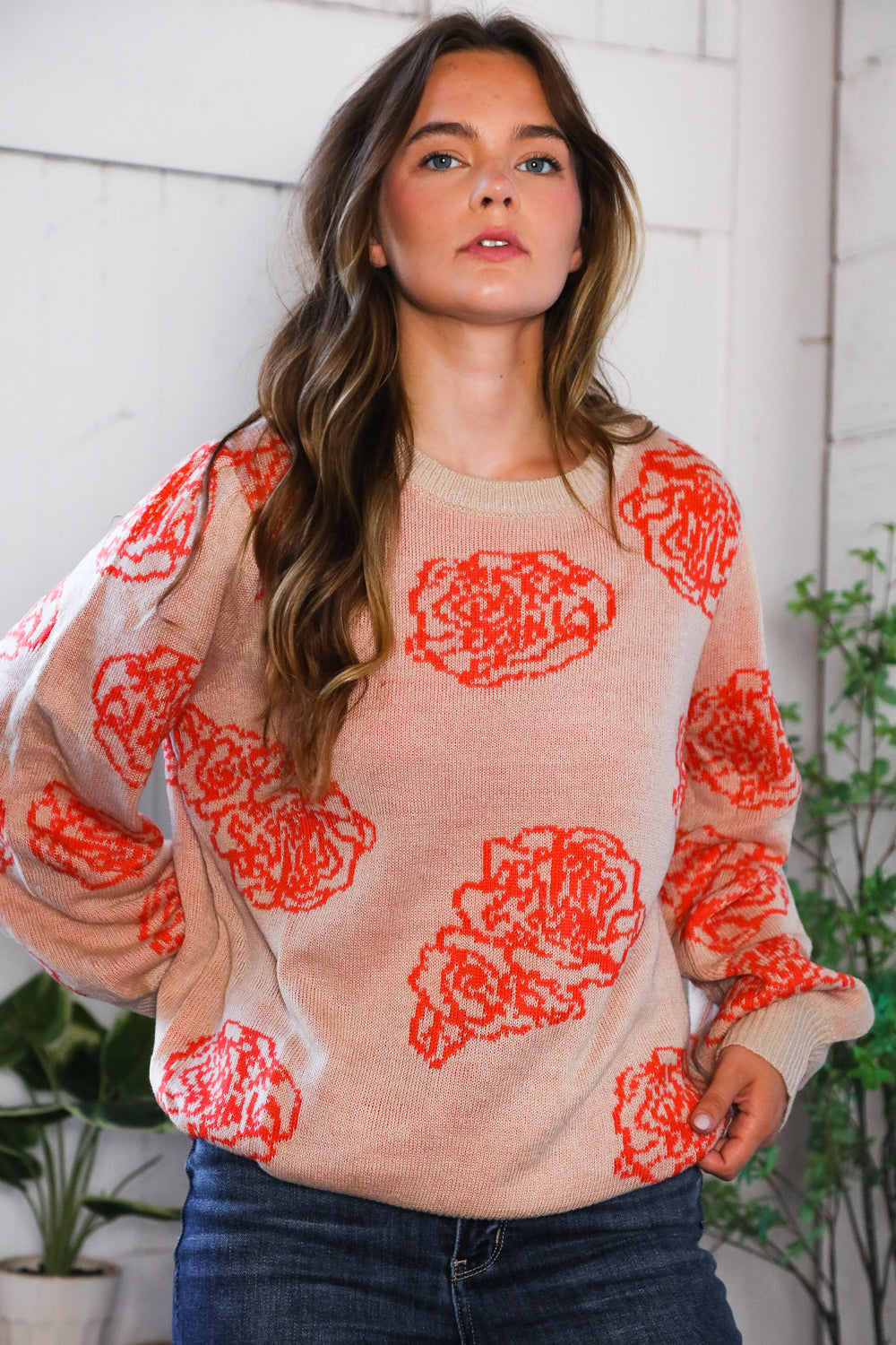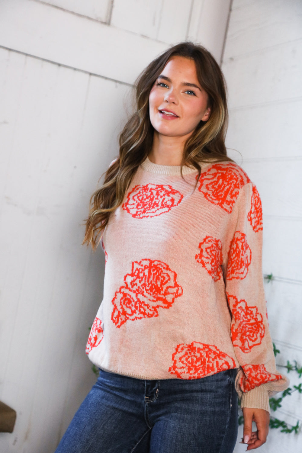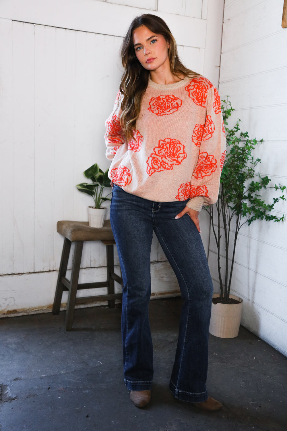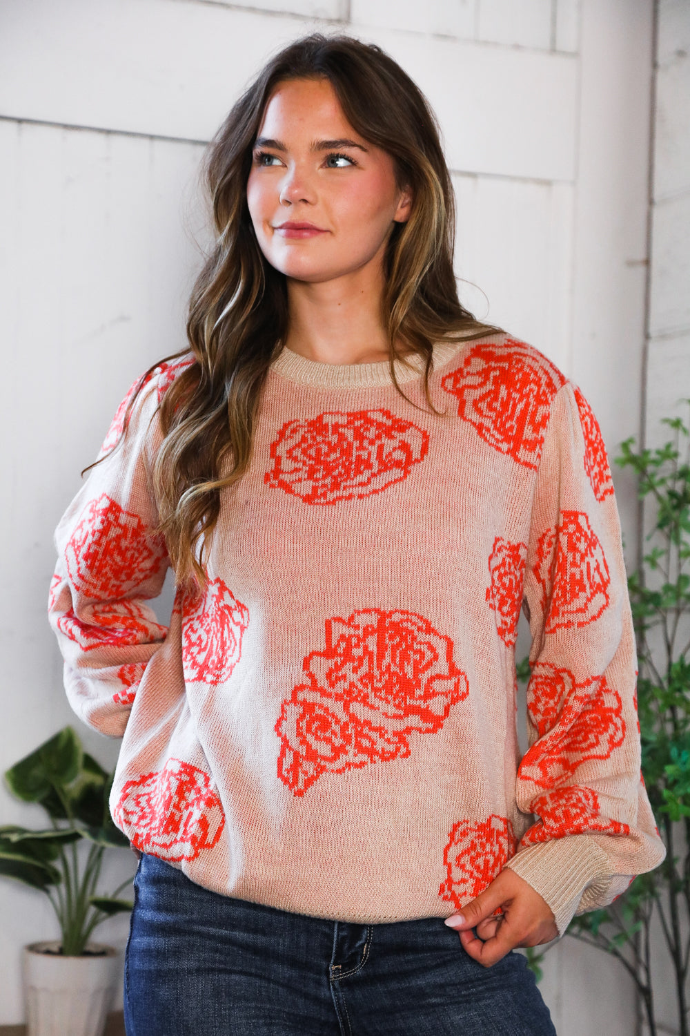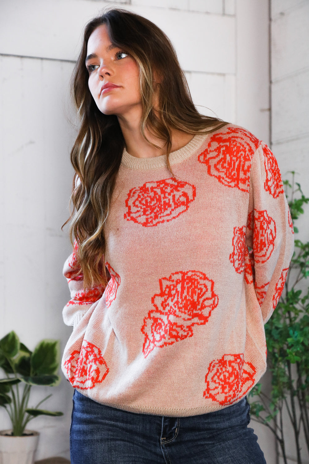 This sweater is just the right mix of cozy and fun. The soft oatmeal knit is scattered with coral rose designs that give it a sweet but playful vibe. It’s got a relaxed fit with ribbed cuffs and hem, so it hangs just right over jeans or a cute skirt. The fabric feels super soft. It's the perfect weight to layer under a coat on those extra cold days.