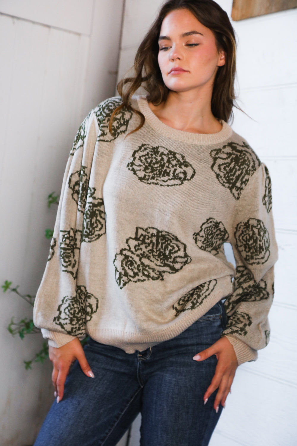 This sweater is just the right mix of cozy and fun. The soft oatmeal knit is scattered with olive rose designs that give it a sweet but playful vibe. It’s got a relaxed fit with ribbed cuffs and hem, so it hangs just right over jeans or a cute skirt. The fabric feels super soft. It's the perfect weight to layer under a coat on those extra cold days.